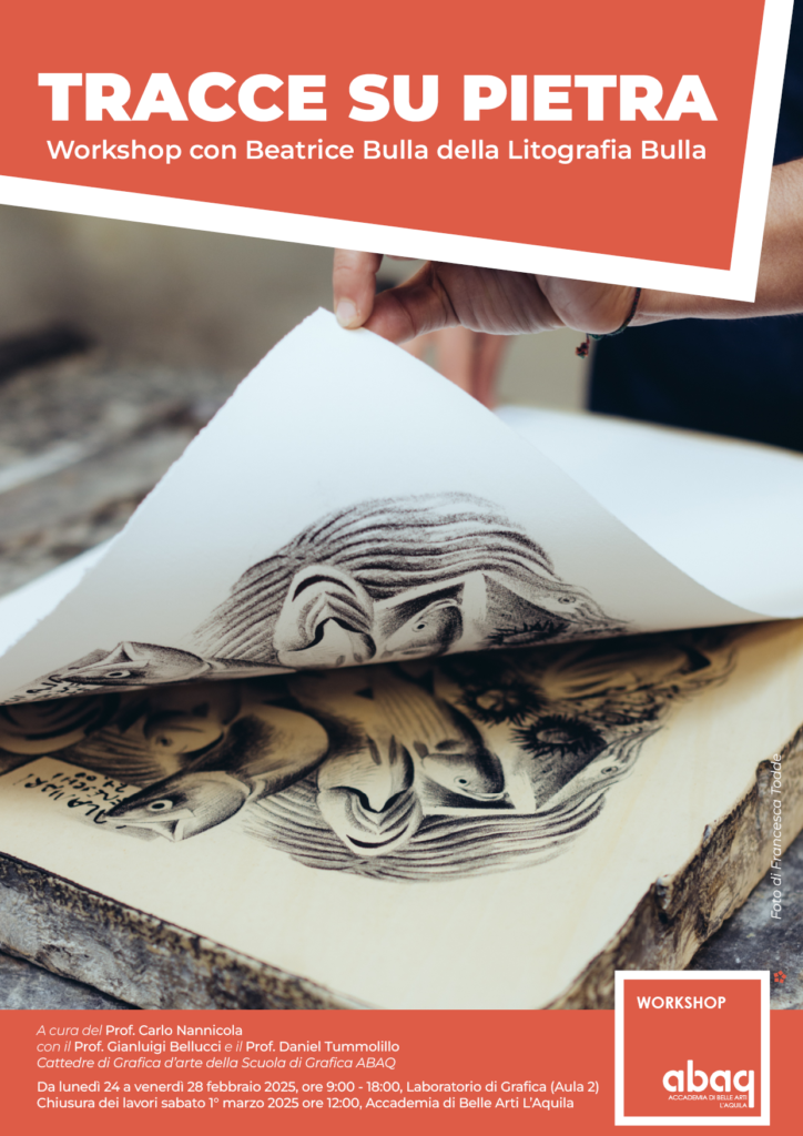Da lunedì 24 a venerdì 28 febbraio 2025, la Scuola di Grafica dell’Accademia di Belle Arti dell’Aquila organizza il workshop di litografia “Tracce su Pietra” guidato da Beatrice Bulla – erede della prestigiosa tradizione del più antico laboratorio litografico Bulla, ancora in attività – e curato dal Prof. Carlo Nannicola, con la collaborazione dei Proff. Gianluigi Bellucci e Daniel Tummolillo,