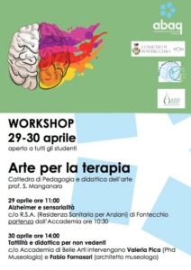 Il 29 e 30 aprile workshop di TERAPEUTICA ARTISTICA organizzato insieme al Comune di Fontecchio e alla RSA. Progettato all’interno del mio corso di Pedagogia e didattica dell’arte è però aperto a tutti gli studenti interessati. Un’esperienza sicuramente stimolante, per attivare uno sguardo differente sulla disabilità e, perchè no, sull’arte stessa.